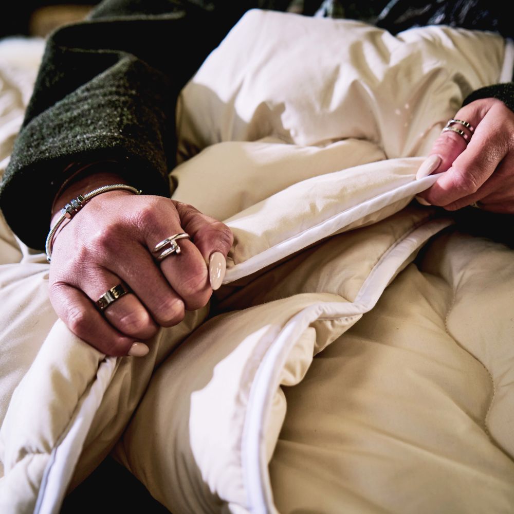 Most of our luxury duvets are made from blown fibre, where the duvet casing is filled be the fibre. With our new innovative Cheviot wool we wanted to use the carding technique. The mechanical carding process disentangles and intermixes the fibres, creating a fluffy, soft and voluminous material. The filling is folded and the duvet casing is then stitched onto and through the wool, producing a fill that is unwavering overtime and stays plump and bouncy, not allowing the wool to move around.